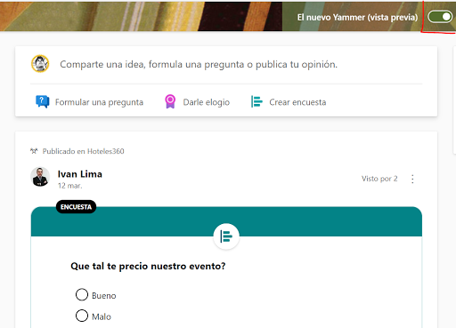 Por último ya solo debes ubicar en tu portal de Yammer el interruptor para poder disfrutar de la nueva experiencia de tu aplicación que ahora incluye realizar eventos en vivo, contactarte con toda tu organización desde un sistema de mensajería totalmente mejorado, disfrutar de sus nuevas integraciones con Outlook, reportar conversaciones, ser uno solo con Microsoft Teams y más.